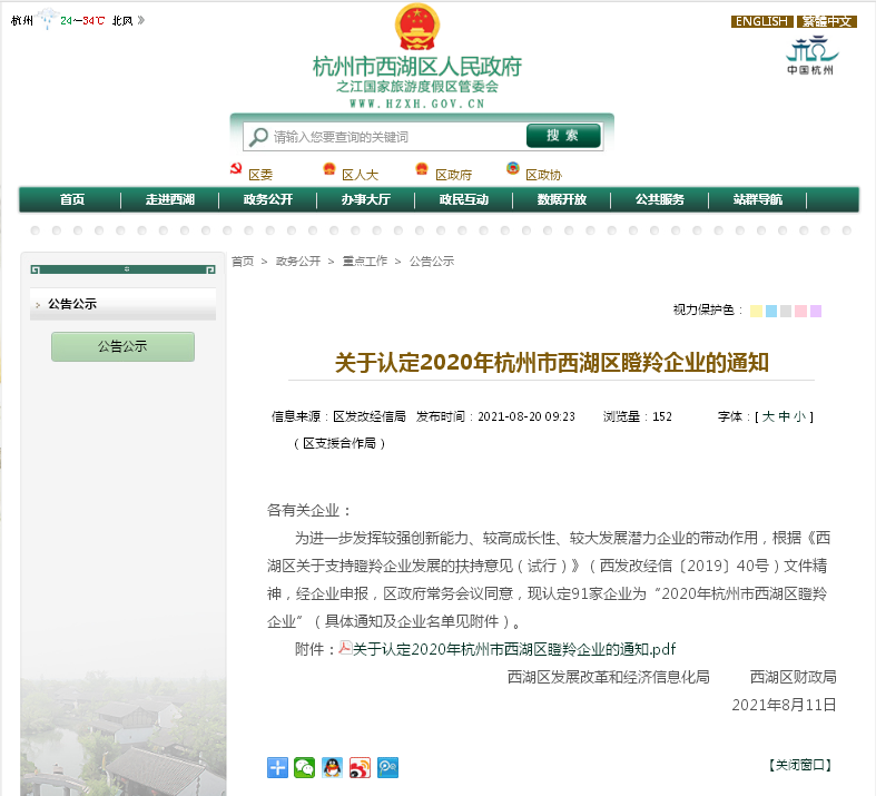 銀江環保入選“2020年杭州西湖區瞪羚企業”榜單