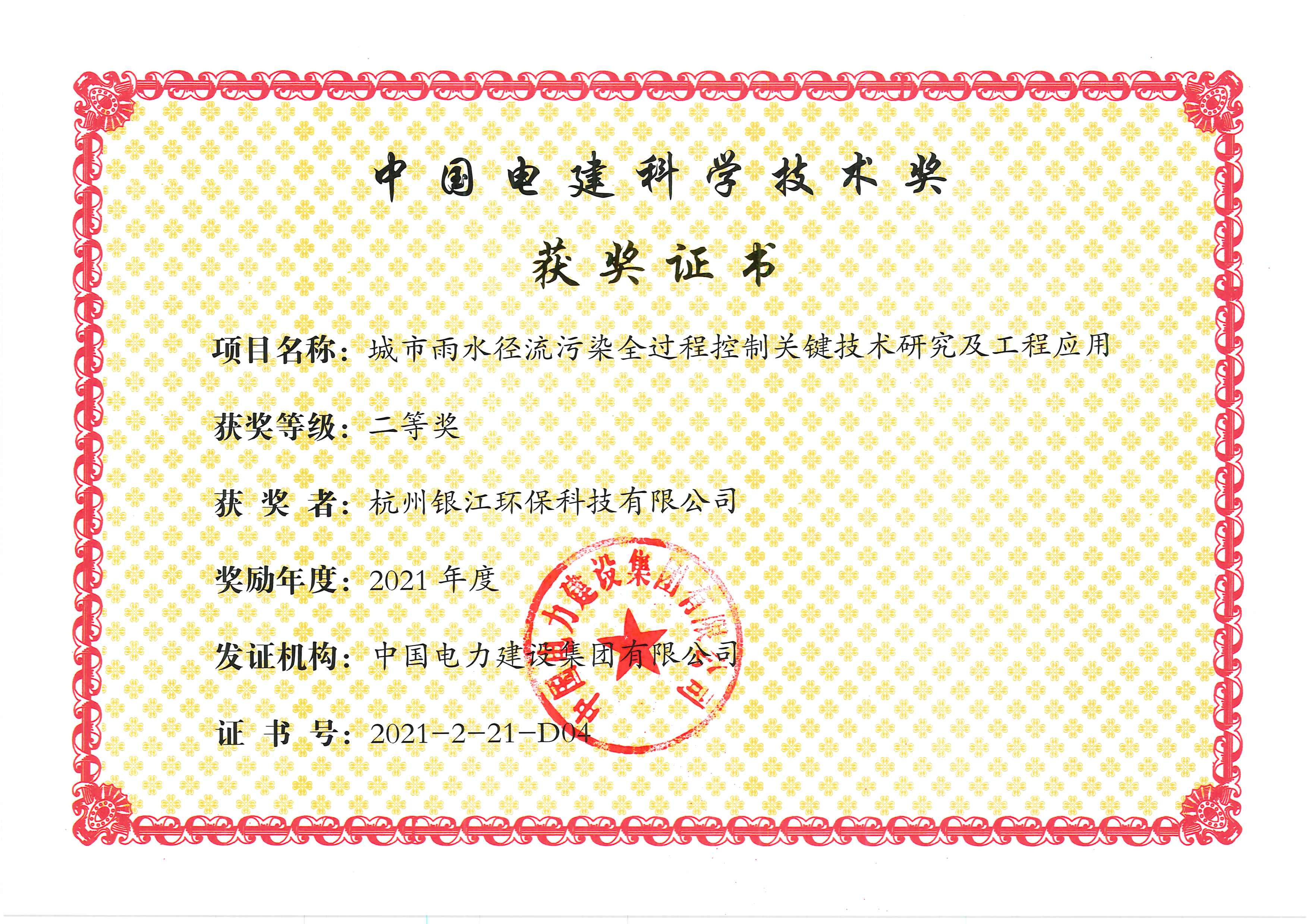 銀江環保《城市雨水徑流污染全過程控制關鍵技術研究及工程應用》獲中國電建科學技術二等獎。