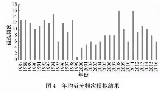 CSO事件劃分后的統計結果如圖4、圖5所示。年均溢流頻次為9.4次,其中最大年份為2008年,溢流16次;最小年份為1999年,溢流1次。年均溢流體積為1.45萬m3,最大溢流體積為3.64萬m3,出現于2016年,6~8月份溢流頻次占年均溢流頻次的比例為83%。