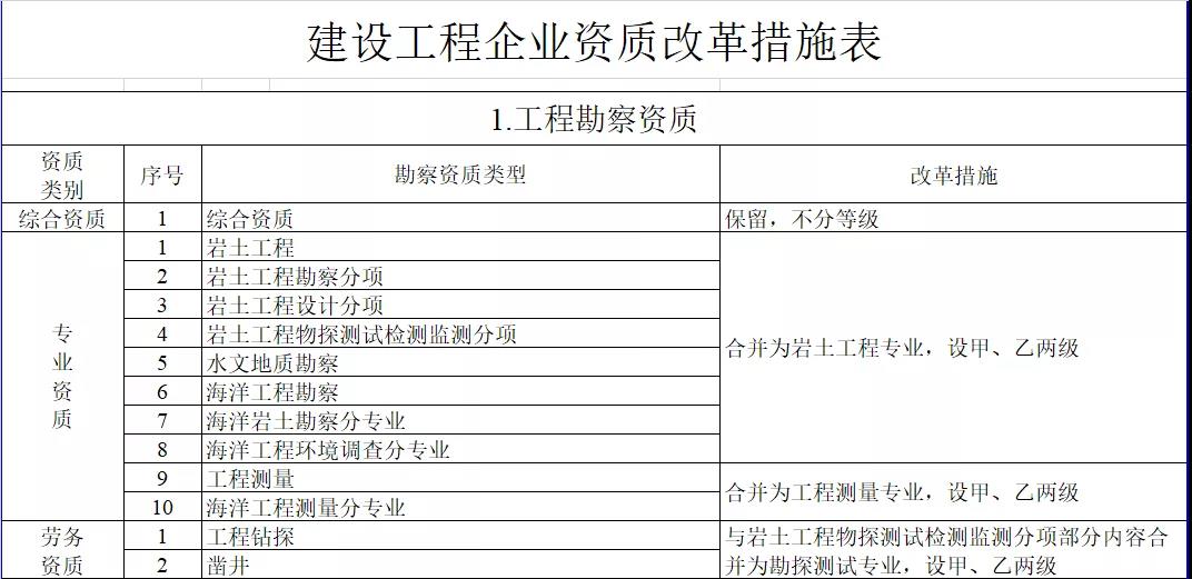 1.工程勘察資質(zhì)。保留綜合資質(zhì);將4類專業(yè)資質(zhì)及勞務(wù)資質(zhì)整合為巖土工程、工程測量、勘探測試等3類專業(yè)資質(zhì)。綜合資質(zhì)不分等級,專業(yè)資質(zhì)等級壓減為甲、乙兩級。