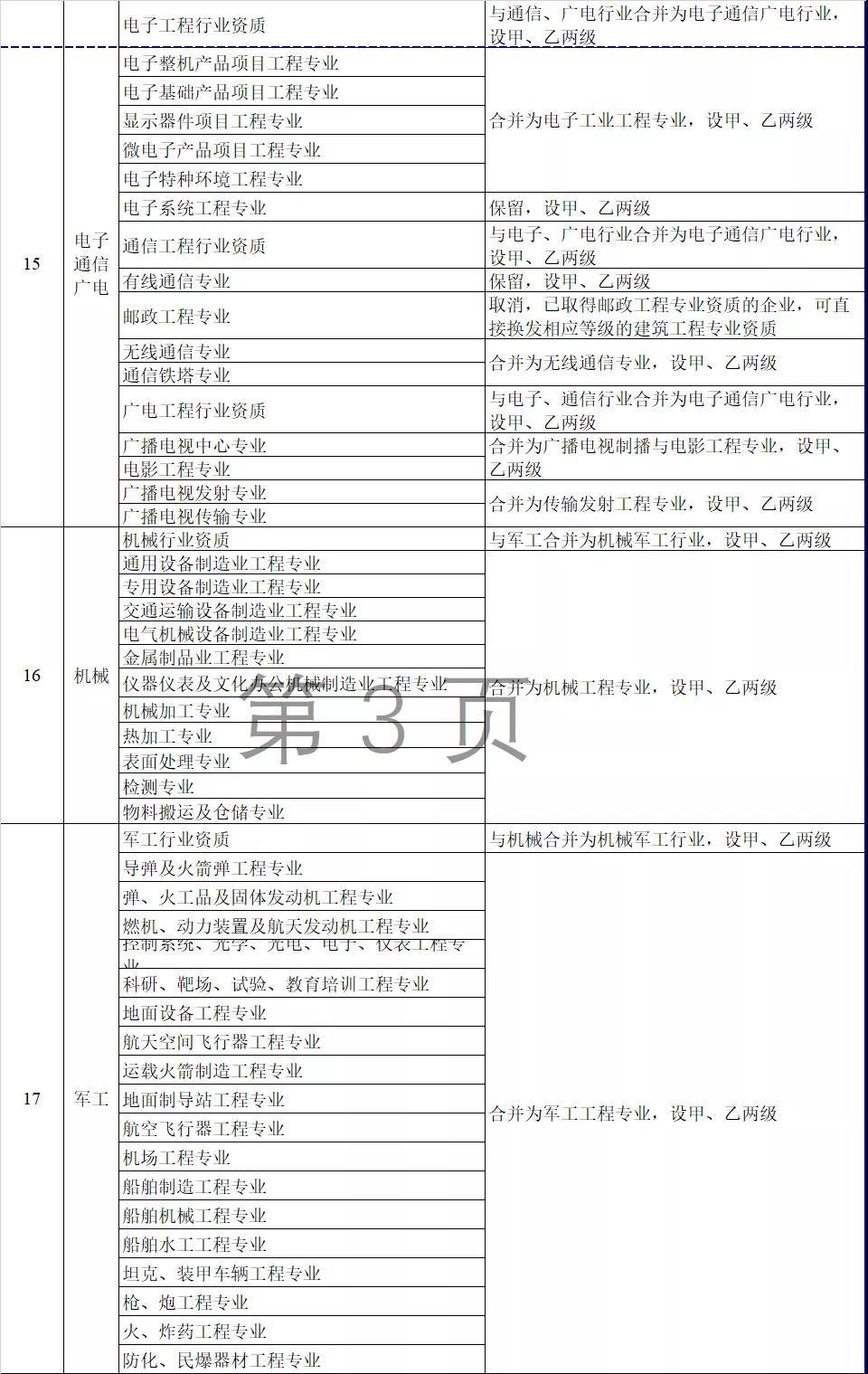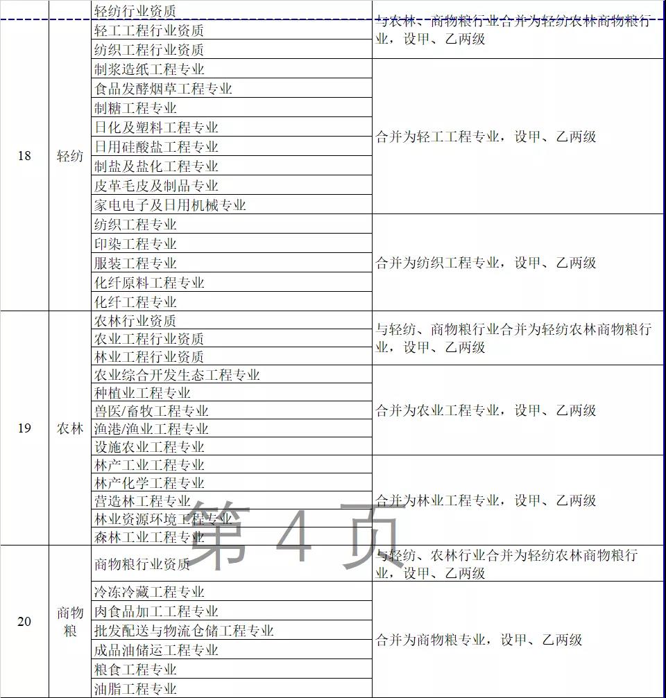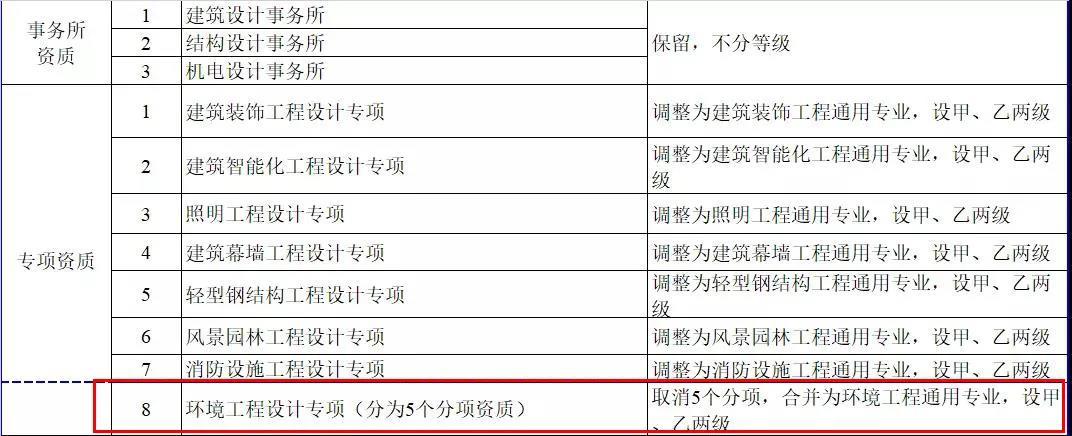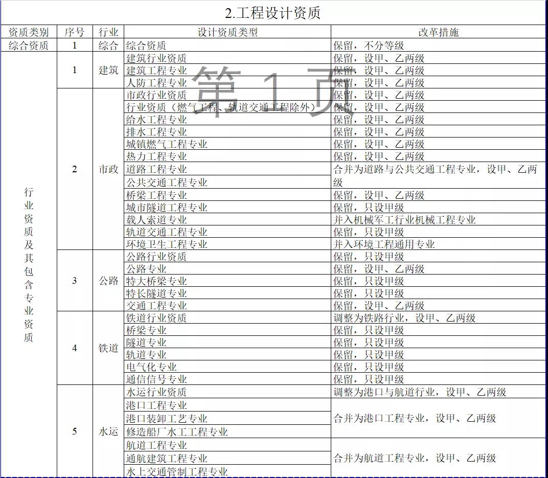 2.工程設(shè)計(jì)資質(zhì)。保留綜合資質(zhì);將21類行業(yè)資質(zhì)整合為14類行業(yè)資質(zhì);將151類專業(yè)資質(zhì)、8類專項(xiàng)資質(zhì)、3類事務(wù)所資質(zhì)整合為70類專業(yè)和事務(wù)所資質(zhì)。綜合資質(zhì)、事務(wù)所資質(zhì)不分等級;行業(yè)資質(zhì)、專業(yè)資質(zhì)等級原則上壓減為甲、乙兩級(部分資質(zhì)只設(shè)甲級)。