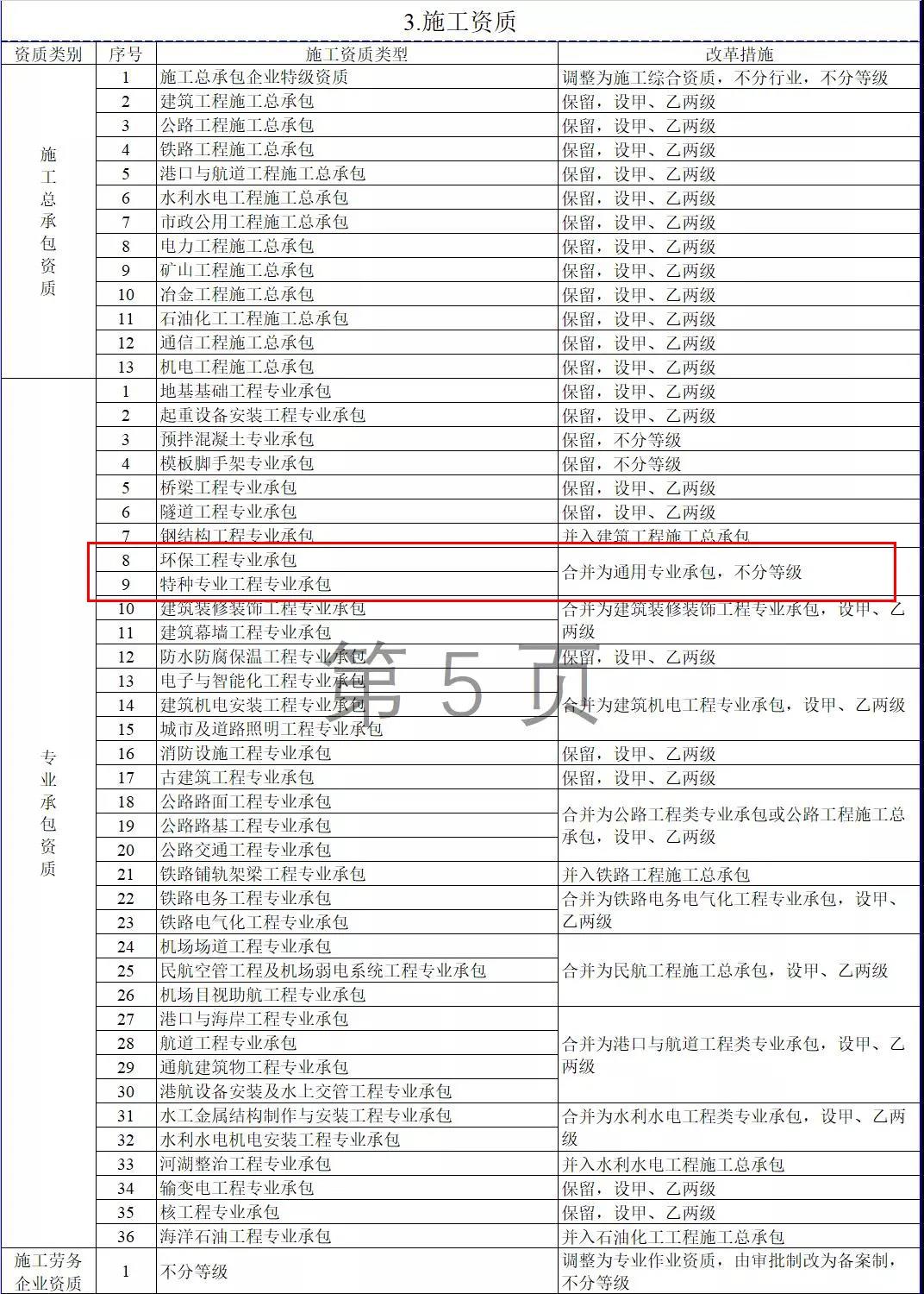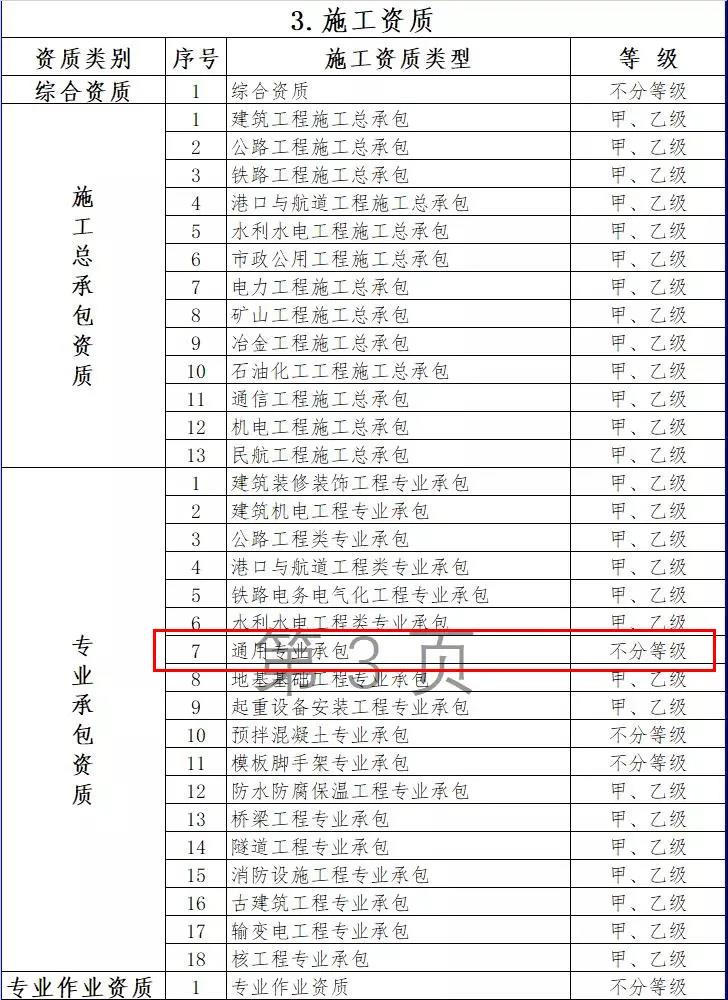3.施工資質(zhì)。將10類施工總承包企業(yè)特級資質(zhì)調(diào)整為施工綜合資質(zhì),可承擔(dān)各行業(yè)、各等級施工總承包業(yè)務(wù);保留12類施工總承包資質(zhì),將民航工程的專業(yè)承包資質(zhì)整合為施工總承包資質(zhì);將36類專業(yè)承包資質(zhì)整合為18類;將施工勞務(wù)企業(yè)資質(zhì)改為專業(yè)作業(yè)資質(zhì),由審批制改為備案制。綜合資質(zhì)和專業(yè)作業(yè)資質(zhì)不分等級;施工總承包資質(zhì)、專業(yè)承包資質(zhì)等級原則上壓減為甲、乙兩級(部分專業(yè)承包資質(zhì)不分等級),其中,施工總承包甲級資質(zhì)在本行業(yè)內(nèi)承攬業(yè)務(wù)規(guī)模不受限制。