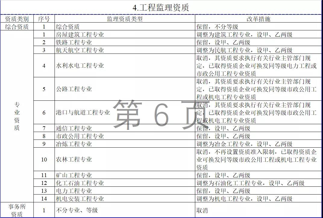 4.工程監(jiān)理資質(zhì)。保留綜合資質(zhì);取消專業(yè)資質(zhì)中的水利水電工程、公路工程、港口與航道工程、農(nóng)林工程資質(zhì),保留其余10類專業(yè)資質(zhì);取消事務(wù)所資質(zhì)。綜合資質(zhì)不分等級,專業(yè)資質(zhì)等級壓減為甲、乙兩級。