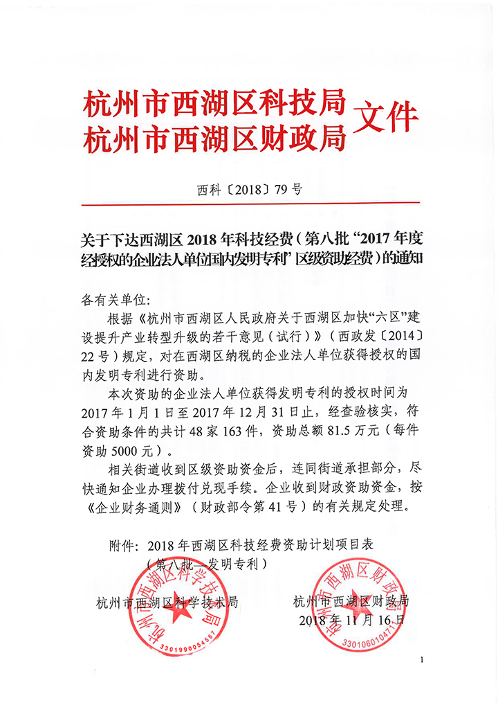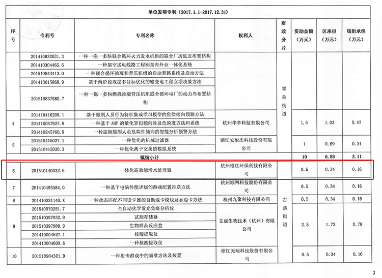 恭喜銀江環保榮獲政府資助30.5萬,其中銀江環保水處理高新技術研究開發中心獲西湖區2018年科技經費資助30萬,一體化高效能污水處理器發明專利獲西湖區科技資助0.5萬。