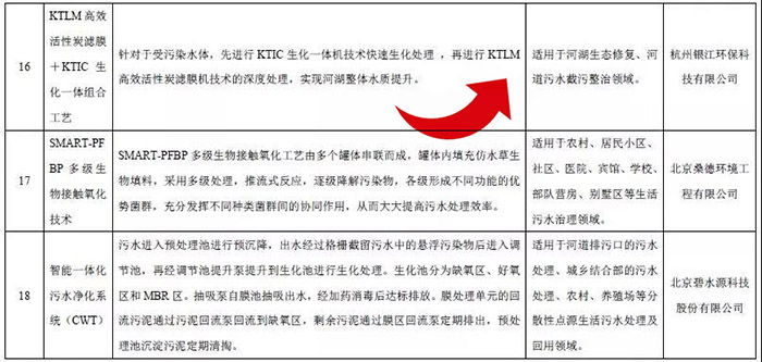 技術(shù)目錄顯示,來自北控水務(wù)的城鎮(zhèn)排水系統(tǒng)智慧運營管控平臺,北排集團城市污水好氧高密度微生物顆粒技術(shù)和基于厭氧氨氧化功能菌群優(yōu)化的污水處理新技術(shù),桑德環(huán)境的SMART-PFBP 多級生物接觸氧化技術(shù),碧水源的“MBR-DF”雙膜技術(shù)和智能一體化污水凈化系統(tǒng)(CWT),銀江環(huán)保的KtLM+KtIC一體化組合工藝等21項水污染防治技術(shù)位列其中。
