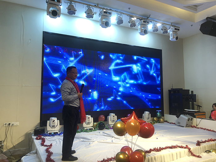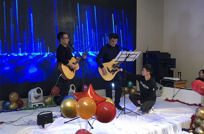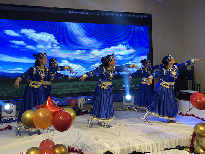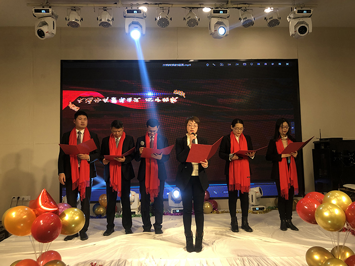 新年酒會和文藝節目同時進行,歡快的開場舞《護花使者》拉開晚會序幕,隨后,優秀員工頒獎,歌曲、舞蹈、彈唱、游戲、抽獎等穿插進行。