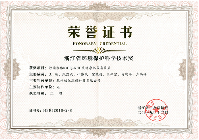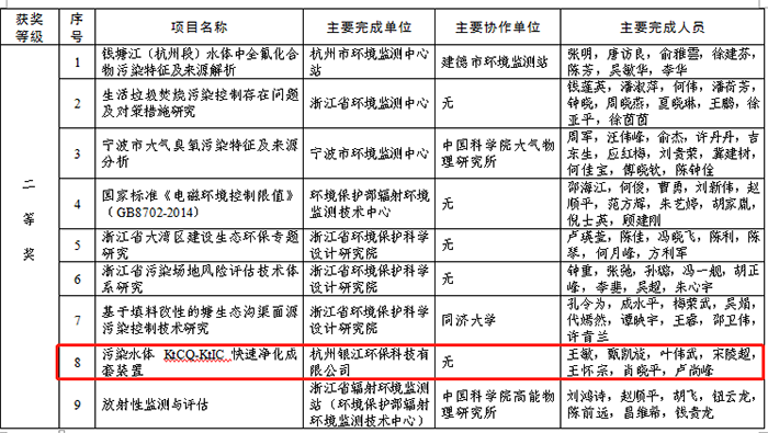 祝賀銀江環保“污染水體KtCQ-KtIC快速凈化成套裝置”榮獲浙江省環境保護科學技術二等獎。該獎項是浙江省生態環境廳設立的環保類獎項,是浙江省環保科技領域最高獎項。