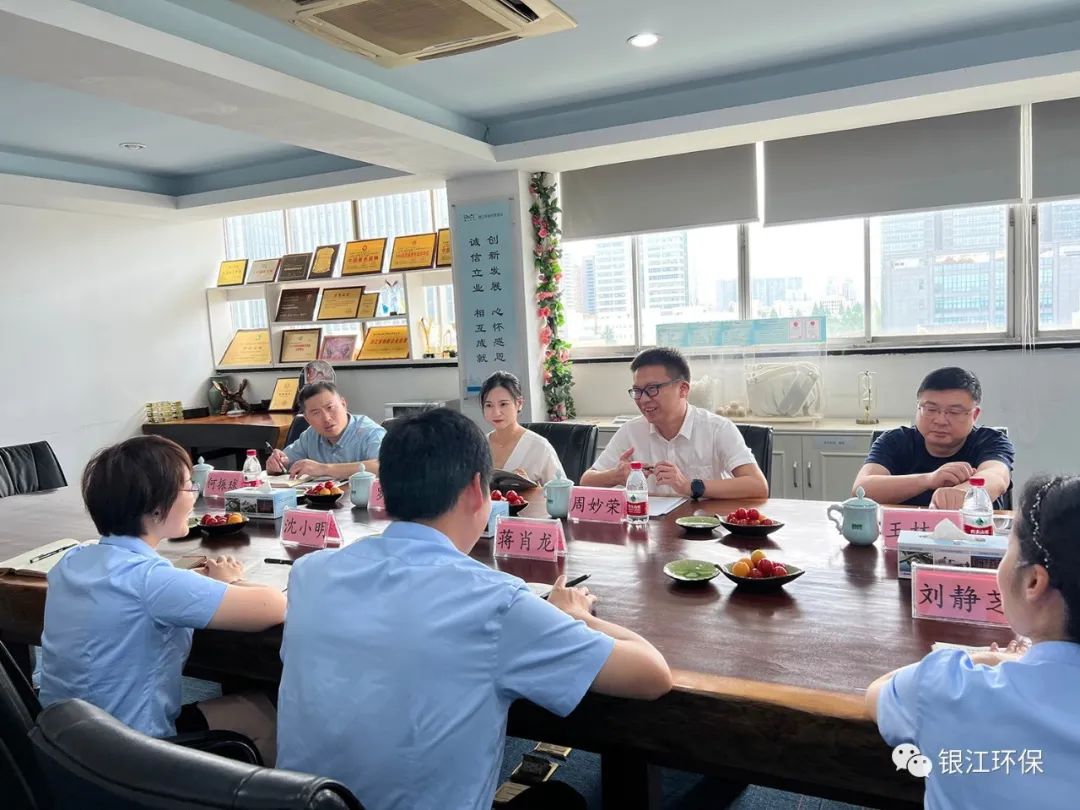 6月28日上午,共青團杭州市委副書記周妙榮、團市委統戰部王林昌、團西湖區委副書記羅琦、團西湖區委團務部部長何振球一行走訪調研杭州銀江環??萍加邢薰?。銀江環保黨支部書記蔣肖龍、常務副總沈小明等公司管理人員熱情接待,并作工作匯報。