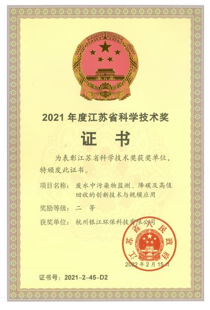 銀江環保《廢水中污染物監測、降碳及高值回收的創新技術與規模應用》獲2021年度江蘇省科學技術獎二等獎。