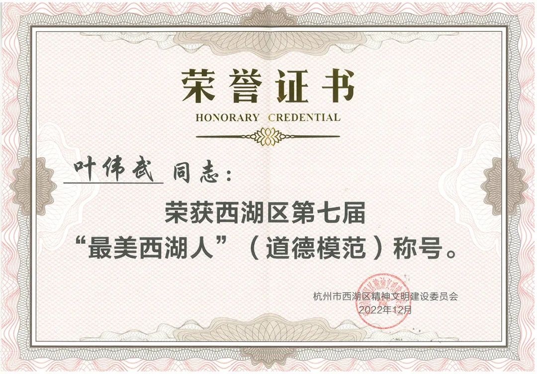 董事長葉偉武榮獲西湖區第七屆“最美西湖人”(道德模范)稱號發布日期:2023-01-13