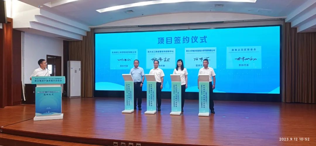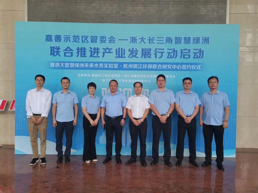 2023年9月12日上午,嘉善示范區管委會-浙大長三角智慧綠洲聯合推進產業發展行動啟動大會在嘉善縣舉行,啟動大會也開展了杭州銀江環保與浙江大學長三角智慧綠洲創新中心未來水務實驗室成立聯合研究中心的簽約儀式。